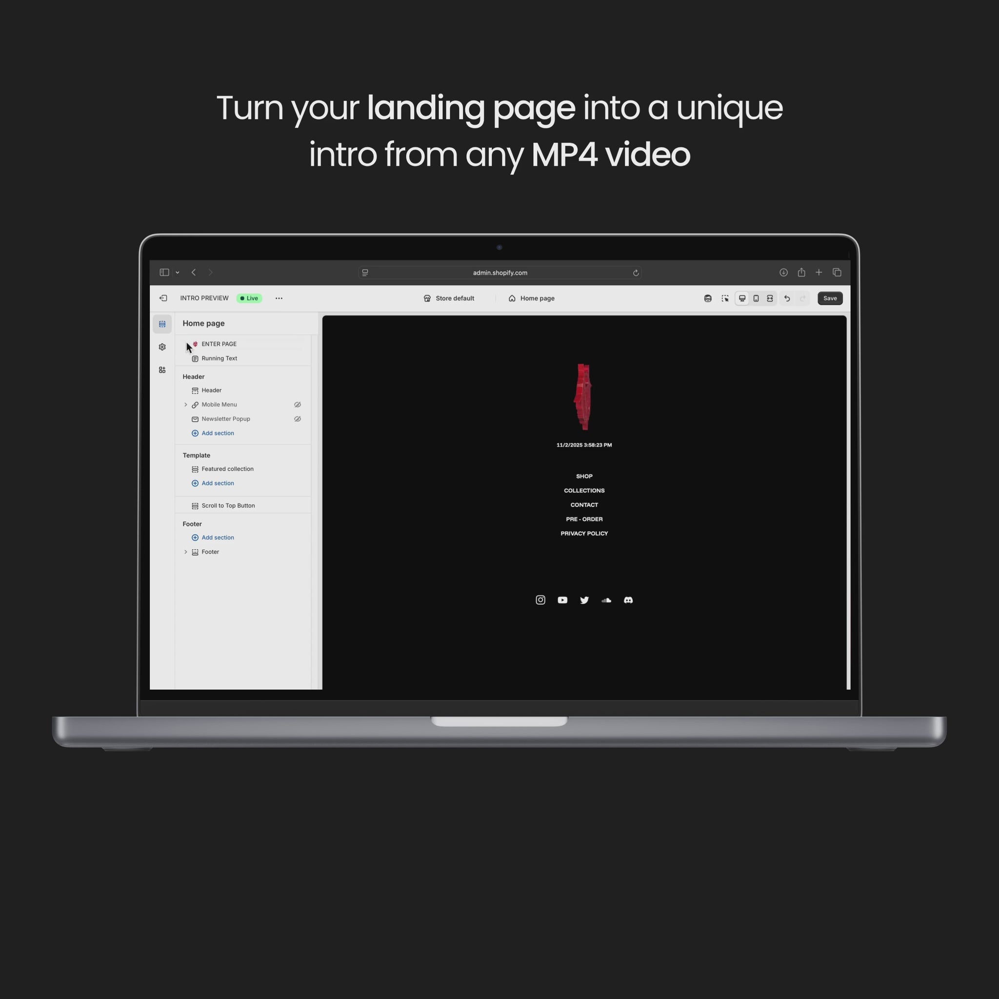 Customization runs deep — choose from video, GIF, image, gradient or solid backgrounds, apply your own cursor style, typography, glow effects, preloader animation, countdown timer, logo motion, and let your music player set the tone while customers browse.