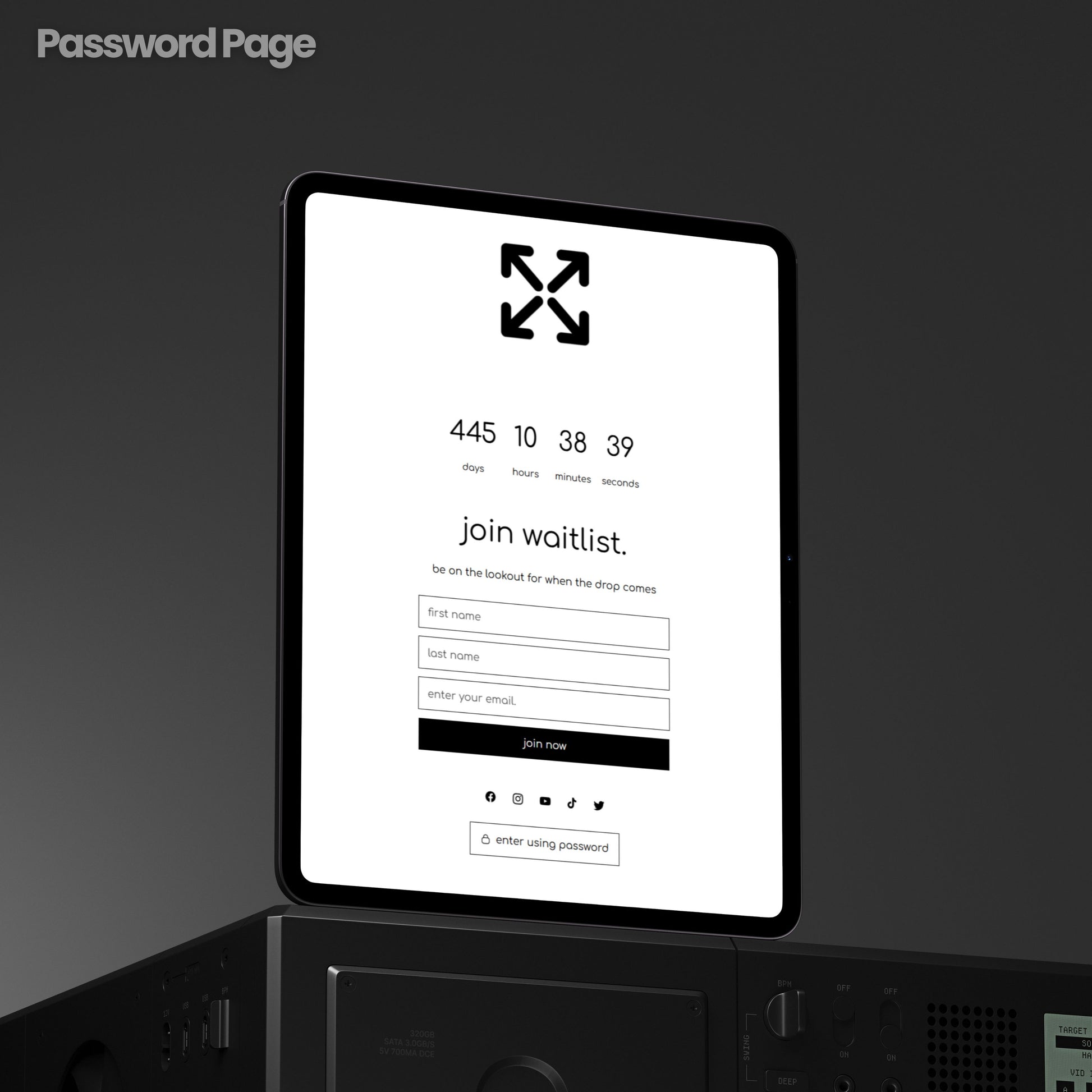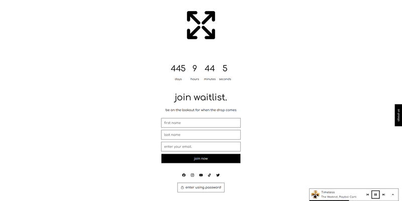 From the moment someone hits your password page, they don’t just see a “coming soon” screen — they enter a pre-drop environment. With a built-in Join Waitlist form (First Name, Last Name, Email) and a dedicated About Us panel on the left, you can introduce your story before the site even opens. Add date, time, typewriter motion text, and turn your pre-launch into a moment that feels like a real campaign drop.