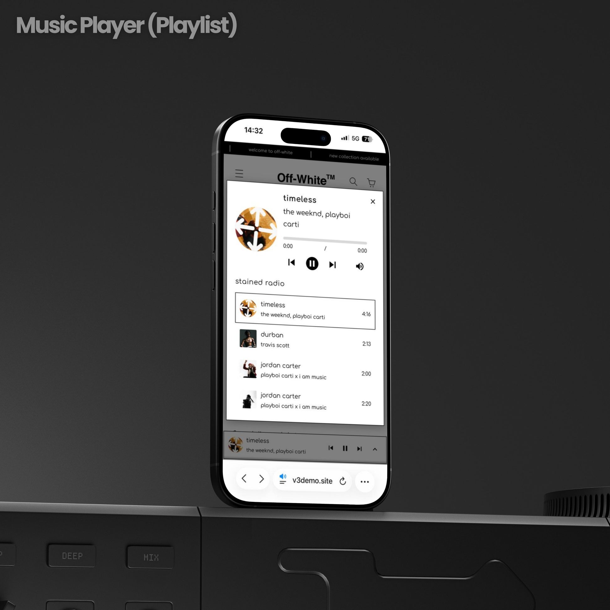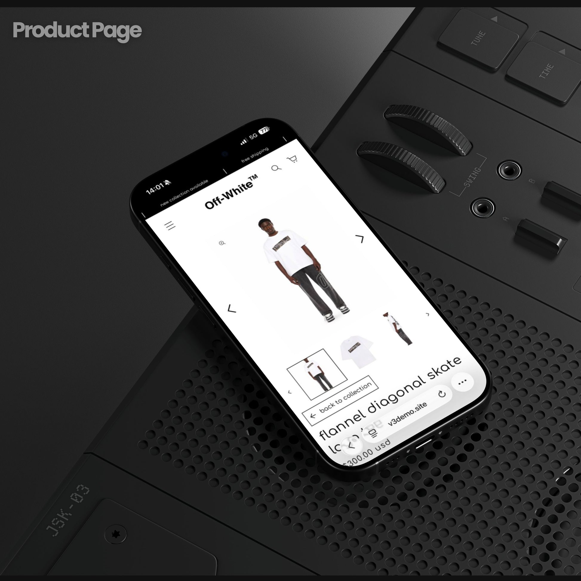 The theme comes with a custom Music Player system — upload your cover disc design, add up to 50 tracks, and let your audience browse your site while your playlist sets the brand mood. Product pages unlock a full-screen zoom mode with arrow navigation and a clean close icon — built to feel more like browsing campaign shots than a basic product gallery.